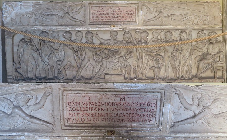 Musei Vaticani: Sarcophagus of C. Iunius Euhodus, head of the Guild of the Fabri Tignarii, and Metilia Acte, his wife, who was a priestess at the Magna Mater temple (M.D.M = Magnae Deum Matri). The sarcophagus is dated after 170 AD