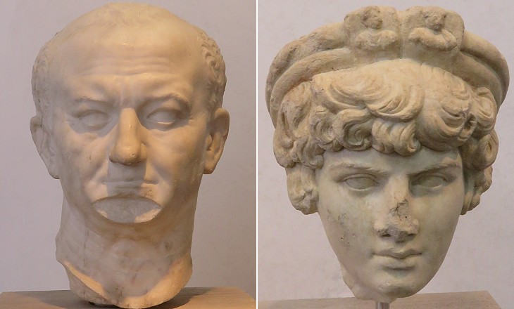 Museo Nazionale Romano: heads found at Campo della Magna Mater: (left) Emperor Vespasian; (right) Antinous, Emperor Hadrian's favourite