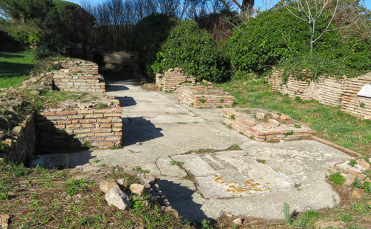 Travellers who entered ancient Ostia at Porta Romana found themselves in an area bursting with life because of its shops and baths. The very few who approached the town from Porta Laurentina felt as if they had arrived at a holy place. The area adjoining the gate is still redolent of its ancient religious character. Few visitors venture to this part of the archaeological site because it does not retain "must see" monuments and this adds to the magic of the place.