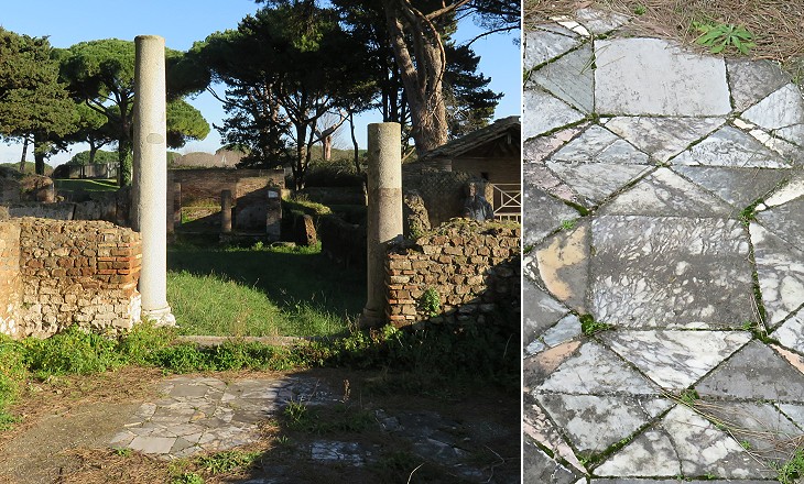 (left) Scuola degli Hastiferi (Spear-bearers) and Tempio di Bellona in the background; (right) marble floor of Scuola degli Hastiferi