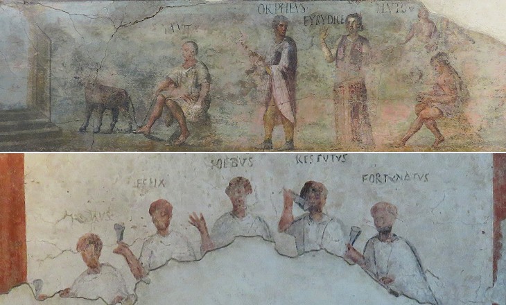Musei Vaticani: frescoes of the first half of the IIIrd century AD from the Necropolis of Porta Laurentina: (above) Orpheus' descent to the underworld to rescue Eurydice; (below) a funerary banquet