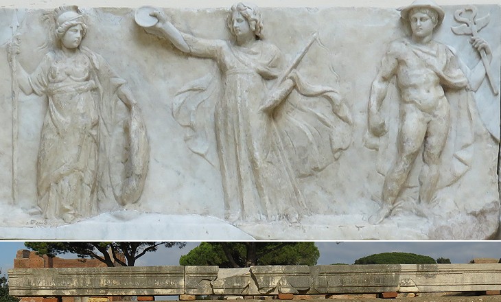 (above) Museo di Ostia: relief found at Terme del Foro portraying Concordia between Minerva and Mercury; (below) inscription celebrating a restoration by Vincentius Celsius Ragonius