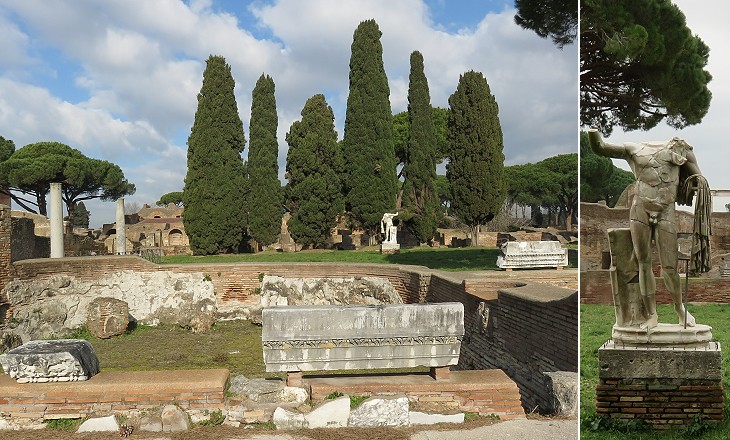 (left) Foro della Statua Eroica seen from the "frigidarium" (cold room) of Terme del Foro; (right) cast of a statue found in the area