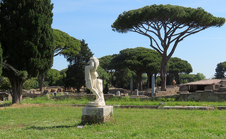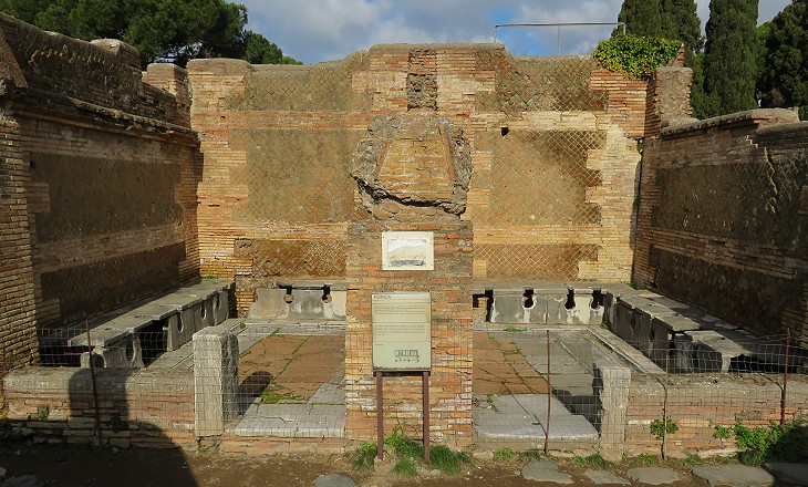 The Forum was a gathering point for the citizens of Ostia who spent hours there and ... had to satisfy some biological needs. A narrow street on the south-eastern side of the Forum led to a public latrine which was installed in the site previously occupied by two adjoining shops. It had twenty seats. In general we assume the Romans sat on the openings of the marble benches, but not all archaeologists agree on that and some suggest they defecated in a squatting posture.