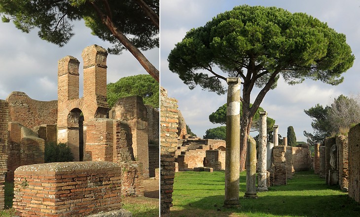 Terme del Foro: (left) pillars at the eastern end of the baths; (right) southern portico of the palaestra