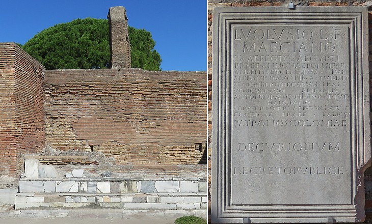 Archaeologists have found a number of hairpins in the halls of the baths, which were therefore open to women (most likely in the morning). Some finely preserved inscriptions found in the Forum have been hung on the walls of the calidaria. They shed light on the careers of magistrates and advisers to the emperors. Lucius Volusius Maecianus was a famous jurist of his time and a friend of Emperors Antoninus Pius and Marcus Aurelius. He held many important positions, including that of superintendent of the imperial libraries and eventually he was appointed Praefectus Aegypti, Governor of Egypt. The decuriones (highest magistrates) of Ostia erected a statue to him in ca 160.