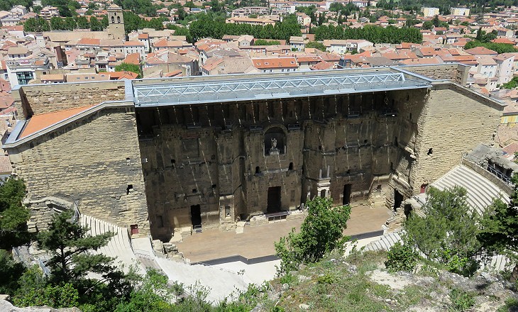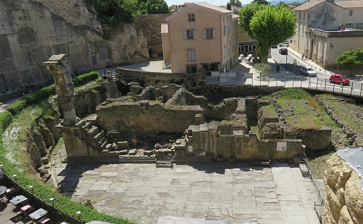 The ruins at the side of the theatre puzzled archaeologists for a long time. The semicircular area which contains them was thought to belong to a circus. Today the general opinion is that the area was one end of the Forum of the town and the ruins those of a temple. Other Roman monuments most likely stood at the top of the hill into which the theatre was partially excavated. They were incorporated into a fortress which was razed to the ground by King Louis XIV.