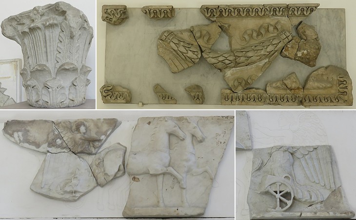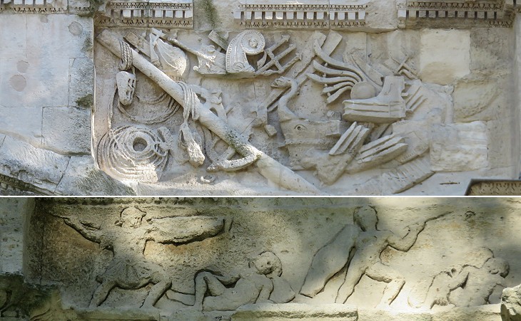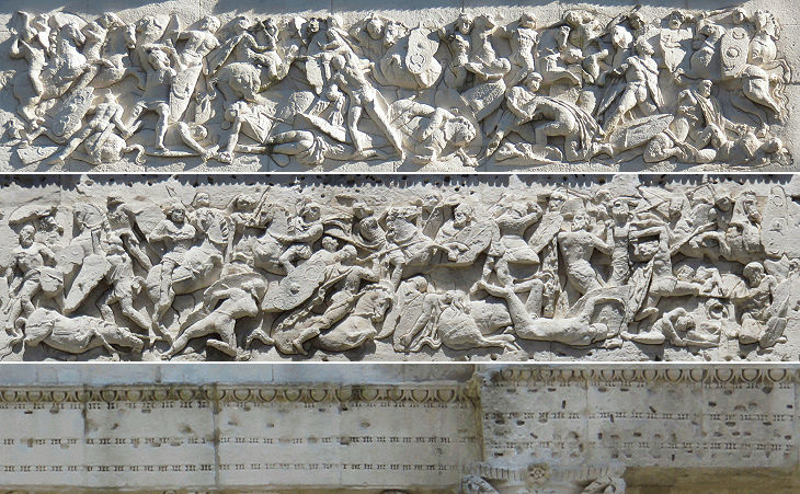 Friezes on the Triumphal Arch: (above) naval trophies; (below) battle between Romans and Gauls or Germans