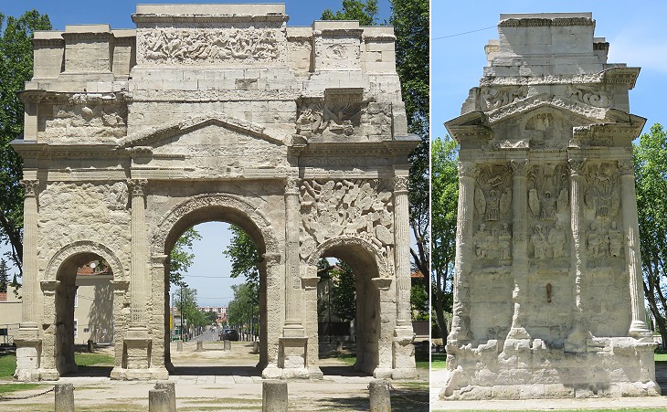 Orange, the Arausio of the Romans, is still distinguished by some noble monuments of antiquity. These consist of a circus, an aqueduct, a temple, and a triumphal arch. (..) It is a very magnificent edifice, adorned on all sides with trophies and battles in basso relievo. The ornaments of the architecture, and the sculpture, are wonderfully elegant for the time in which it was erected; and the whole is surprisingly well preserved, considering its great antiquity. It seems to me to be as entire and perfect as the arch of Septimius Severus at Rome.