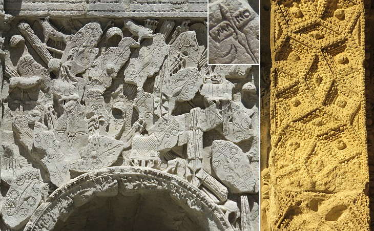 Triumphal Arch: (left) frieze above one of the side arches; (inset) MARIO; (right) decoration of the interior