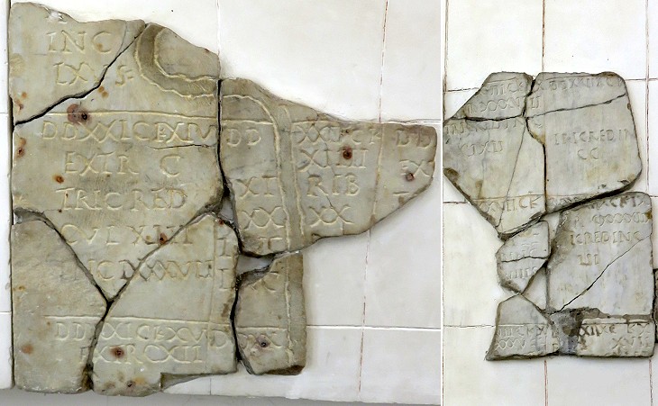 The distribution of land to the veterans was preceded by a survey of the ground (centuriatio) in order to identify the size and location of each individual farm and the need for roads and irrigation canals. The records of the survey were used for tax collection and legal proceedings. Each farm had a square shape which resulted in creating an orderly grid of fields which can still be noticed in the current landscape of some areas in Northern Italy. During the rule of Emperor Vespasian the centuriatio of Orange was updated and the results were carved in a marble map containing data on property and tax value. Each farm was identified with reference to a system of Cartesian coordinates with D(ecumani) as x and C(ardi) as y and its area was expressed in jugeri (0.25 hectares / 0.623 acres). The maps indicate that some farms no longer belonged to veterans (TRIC RED = returned to the Tricastins, the original Gallic inhabitants of the region) and some parcels of land were for public use.