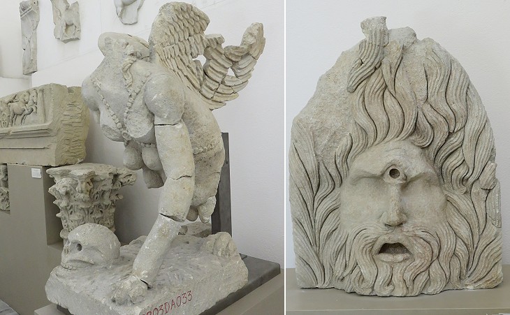 Museum of Orange: (left) funerary monument; (right) "Larva" (mask) of Polyphemus similar to masks at Lyon and Vaison-La-Romaine