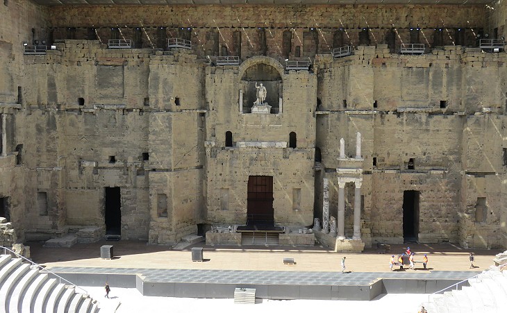 Theatres have often been a mine of archaeological findings because they were usually decorated with statues and reliefs. From this point of view the search for ancient works of art at the theatre of Orange was rather disappointing. The monument had not been covered by earth or rubble as many others and its marbles were most likely calcined or broken into pieces which were used as building material (see a page on Roman works of art related to theatrical performances).