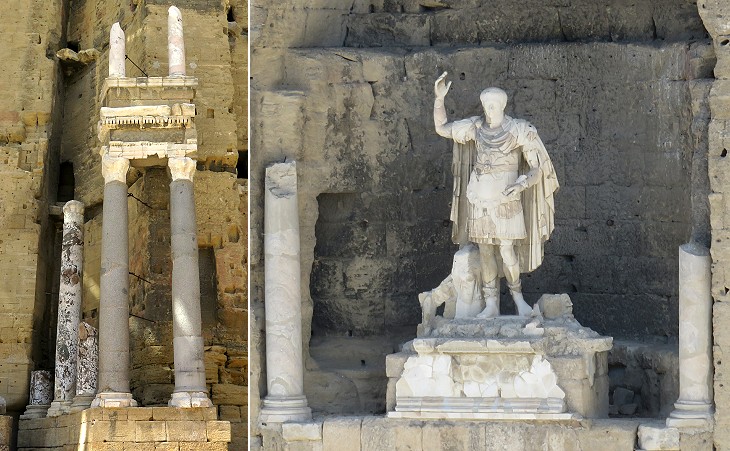 Theatre: details of the "scenae frons": (left) columns; (right) "Statue of Emperor Augustus" which was placed in a central niche in 1951 (the head is not original and the broken pieces of the statue which were found in the 1940s most likely portrayed an emperor or military commander of the IInd century AD)