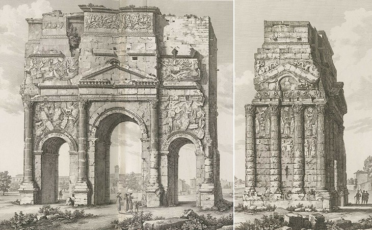 Triumphal Arch in two plates from "Alexandre de Laborde - The Monuments of France Chronologically Classified - 1816-1836": (left) northern side; (right) eastern side