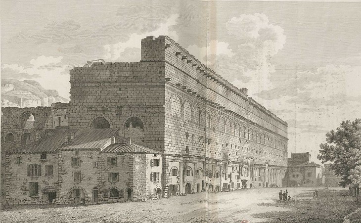 This building conveys a better idea of an antique theatre, and explains more clearly its forms and distribution than any remains now extant; for