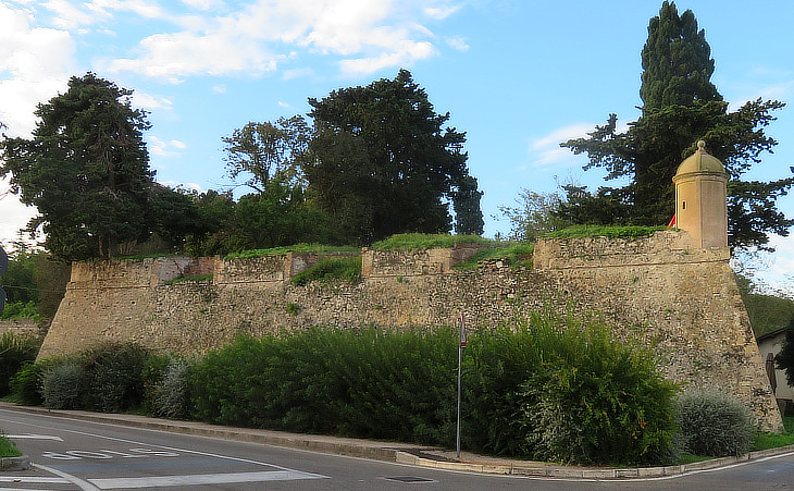 Smaller bastions completed the fortifications on the land side. The bastions were protected by a deep moat. In the XXth century parts of them were demolished and the moat was filled to allow the development of the town and the passage of the railway. You may wish to see the walls of Peschiera del Garda which are still surrounded by a moat and were built in the 1550s or those of Palmanova, the finest example of Italian military architecture, which were built in the 1590s.
