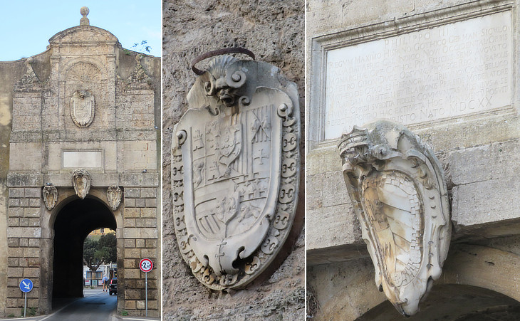 (left) Porta Interna di Terra; (centre) coat of arms of King Philip III (also King of Portugal); (right) 1620 inscription and coat of arms of Pedro Giron, Duke of Osuna, Viceroy of Naples in 1616-1620