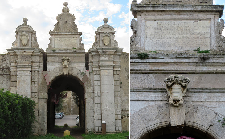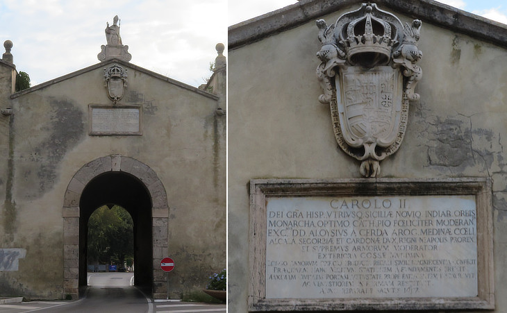 (left) Porta Interna di Terra (town side); (right) coat of arms of King Charles II and inscription making reference to Luis Francisco de la Cerda y Aragón, Duke of Medinaceli, Viceroy of Naples in 1696-1702 (see some of the ancient statues which he shipped to Seville to embellish his family palace)