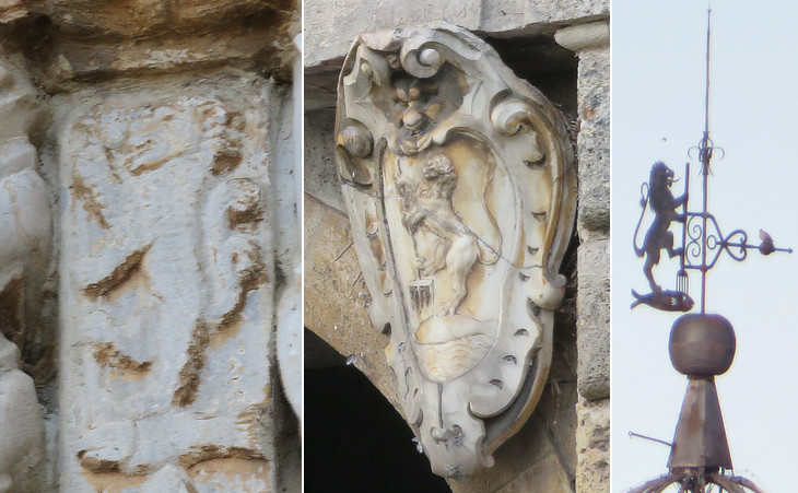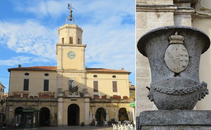 (left) Town Hall; (right) coat of arms of the Grand Duchy of Tuscany when it was ruled by the House of Habsburg-Lorraine (1815-1860)