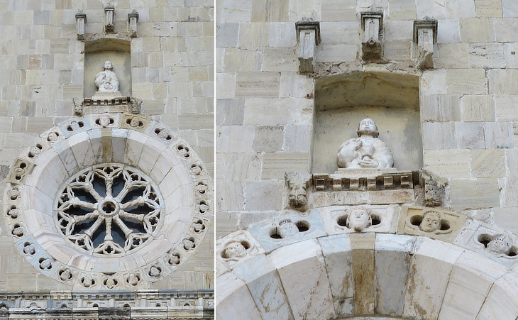 The decoration of the rose window is peculiar to this church because it is based on small heads portraying Charlemagne and kings, queens and bishops of his court, rather than on symbols of the Evangelists, which was rather customary, see S. Pietro at Tuscania and S. Giovanni degli Zoccoli at Viterbo. The name of Orbetello is thought to derive from that of Orvieto, because it was the port of that town.