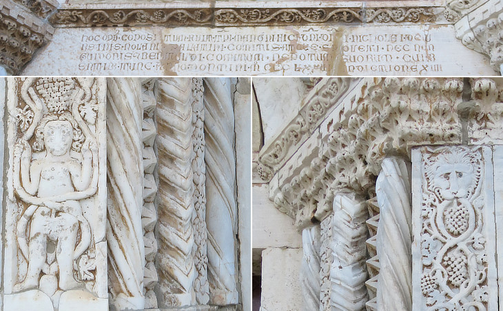 Co-Cathedral: portal: (above) inscription celebrating the construction of the portal in 1376; (below-left) detail showing Adam; (below-right) detail showing the head of a lion