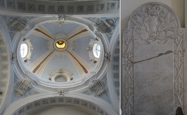 Co-Cathedral: XVIIth century details: (left) ceiling of Cappella di S. Biagio; (right) tombstone
