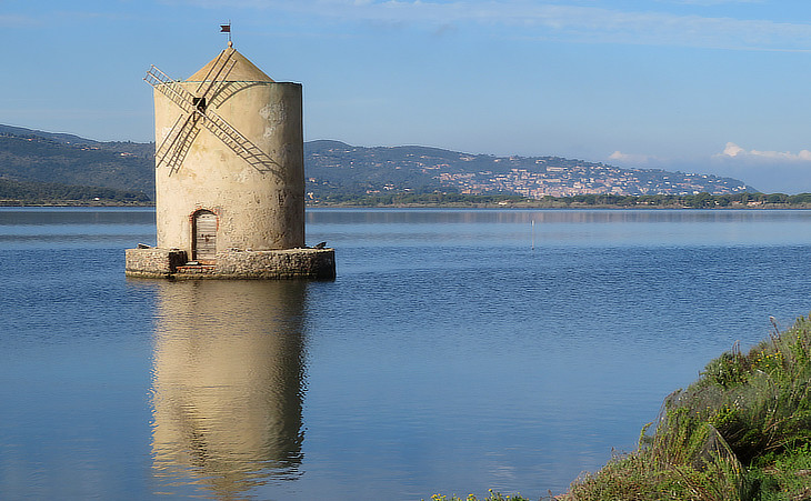 Stagno (Swamp) di Ponente: Spanish windmill near the western end of Orbetello (the only remaining of nine which in origin exploited the tidal rise and fall) and in the distance Porto Santo Stefano