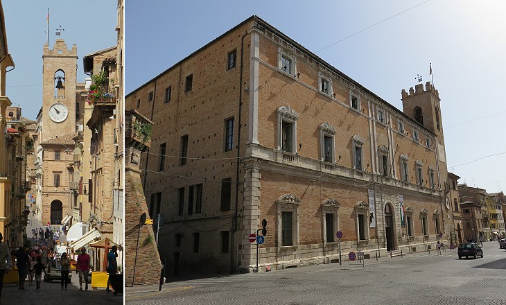 Palazzo Comunale (Town Hall): (left) XIIIth century tower; (right) XVIIth century façade and to its left remaining wall of a fortress