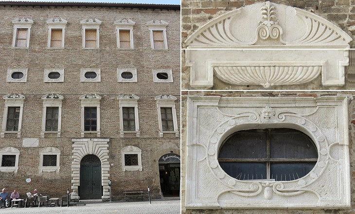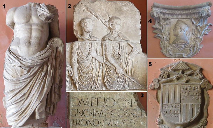 Courtyard of the Town Hall: 1) one of twelve beheaded statues from the Forum of Auximum; 2) relief portraying lictors (Roman officers who preceded consuls or magistrates holding fasces, symbols of power, during public celebrations); 3) inscription making reference to Pompey; 4) capital with a portrait of Francesco Sforza. He was the brother of Alessandro Sforza who ruled over Pesaro and he seized Osimo in 1433; 5) coat of arms of Osimo with the keys of St. Peter, symbol of the Papal State