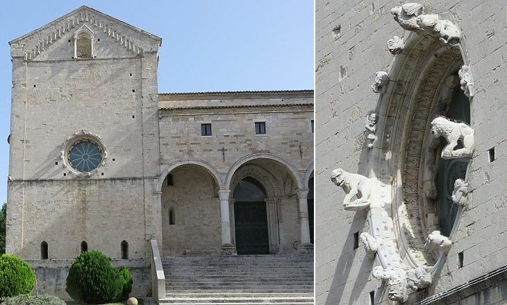 Cathedral: (left) southern side (early XIIIth century); (right) rose window with heads of animals