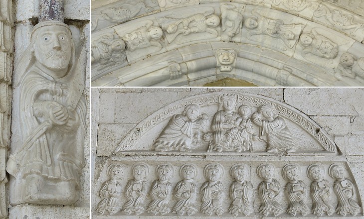 Southern side of the Cathedral: (left) King David in the right portal; (right-above) angels at the sides of the Lamb of God in the central portal; (right-below) relief from the previous cathedral dedicated to St. Vitaliano, Bishop of Osimo in the VIIIth century; it portrays ten apostles; Filippo Lombardo added the upper relief