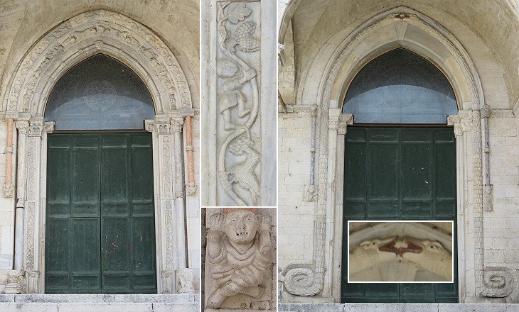 Southern side of the Cathedral: (left) portal at the centre of the porch and details of its decoration; (right) right portal and detail of its decoration