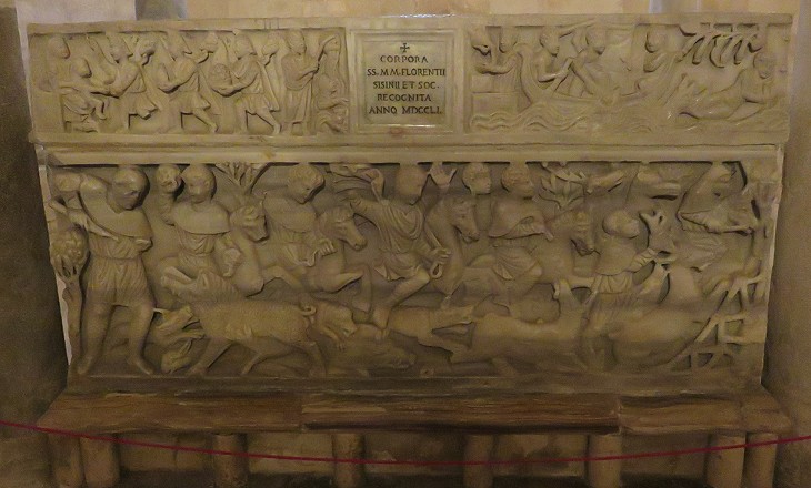 The Cathedral houses other exhibits which are relevant to the history of Osimo. The sarcophagus containing the remains of four martyrs combines traditional Roman subjects with new ones. The lower part depicts a boar hunting scene, whereas the lid depicts four small scenes showing events from the New and the Old Testament (The Nativity and the Adoration of the Magi, St. Peter striking a rock wall and drawing forth water, Noah in the Ark and Jonah being swallowed by a sea monster). These scenes have similarities with other sarcophagi (see a list of ancient sarcophagi which are shown in this website).