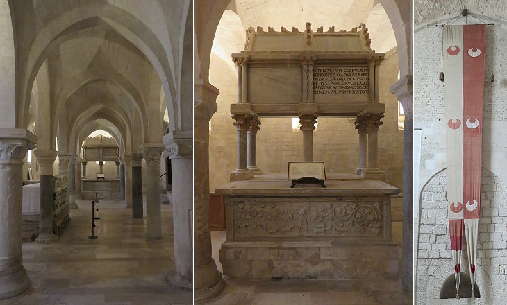 Cathedral: (left/centre) crypt and sarcophagus containing the body of St. Benvenuto, Bishop of Ancona in 1263-1282; (right) Ottoman flag