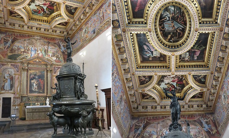 Baptistery: (left) bronze baptismal font by Pietro Paolo and Tarquinio Jacometti; (right) ceiling by Antonio Sarti