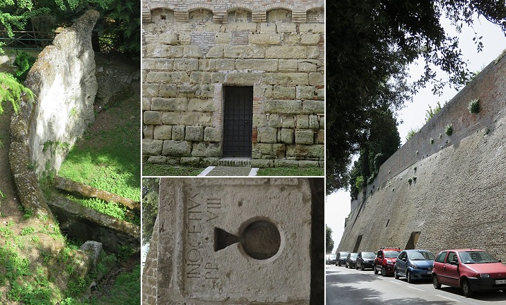 (left) Ruins of Fonte Magna; (centre-above) medieval walls built above the ancient ones; (centre-below) firearm loophole made at the time of Pope Innocent VIII; (right) XVIth century walls