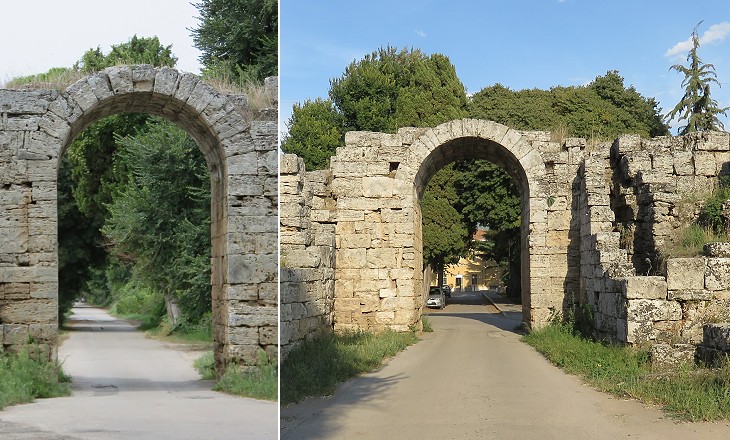 Porta Marina best retains its original design with two towers protecting the access to a square courtyard which was closed by a second gate. The area behind the gate is a private property and one can notice that it stands on higher ground. For many centuries the coastal plain where Paestum is located was intermittently flooded by the River Sele and its tributaries. A thick calcareous layer covered parts of the ancient town.