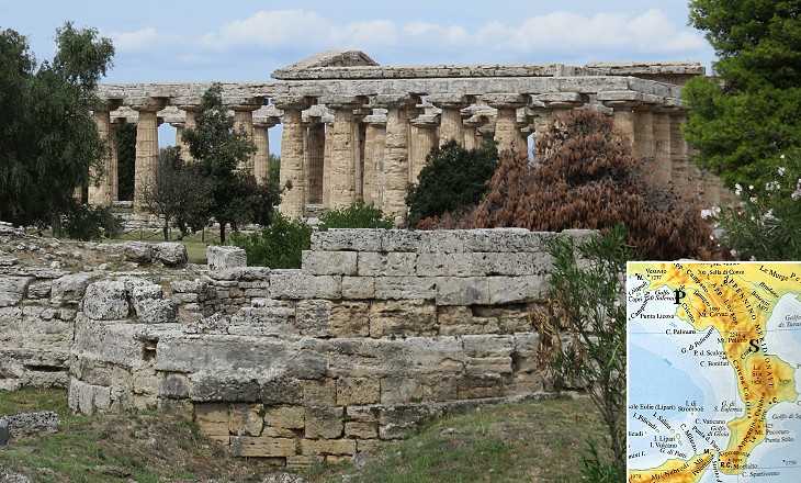 A stretch of the walls and behind them the two southern temples; (inset) map of the region: P/Paestum S/Sybaris