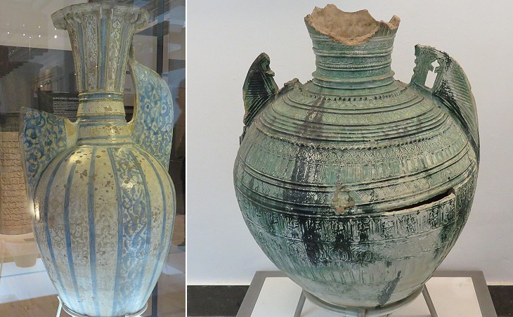 Galleria Regionale di Palazzo Abatellis: (left) gravestone of Pietro Antonio Guerriero (1521); (centre) XIVth century Andalusian vase from a church of Mazara del Vallo (you may wish to see other Andalusian wares from Spanish museums - it opens in another window); (right) XVth century coats of arms of the Pope (perhaps Nicholas V) and of the House of Aragon Kings of Sicily