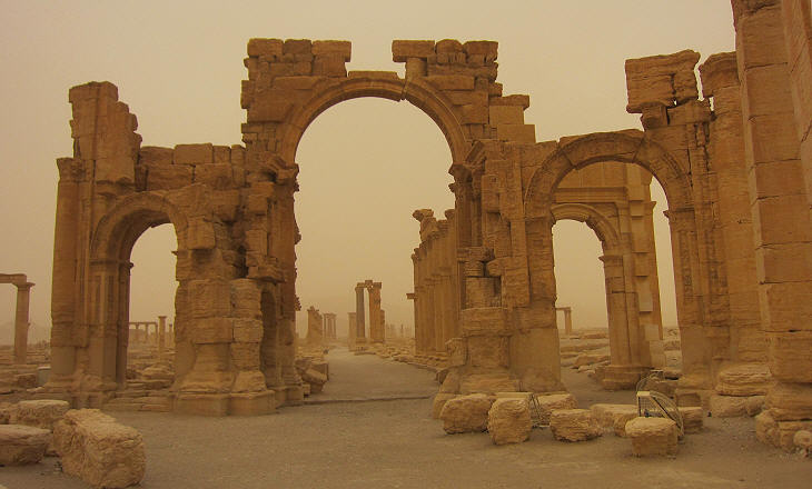 Arch of the (main) Colonnaded Street (this and some other photos illustrating this page were taken during the final phase of a sandstorm)