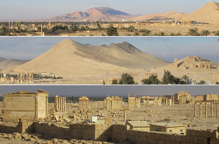 (in descending order) Colonnaded Street from Diocletian's Baths to Tetrapylon; the barren mountains around Palmyra and the south-western necropolis; overall view of Palmyra from behind its western walls