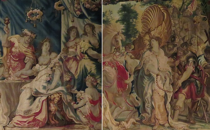 Brussels Art & History Museum: details of tapestries depicting: (left) the wedding banquet of Zenobia; (right) the Queen being chained to the chariot of Aurelian; they were both based on drawings by Justus van Egmont and were made in the workshop of Gerard Peemans in Brussels between 1665 and 1700