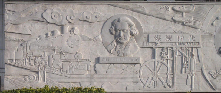 Detail of a relief celebrating the progress of mankind and James Watt