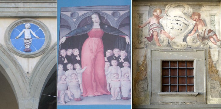 Many artists contributed their works to the embellishment of Spedale degli Innocenti: Andrea della Robbia placed his elegant ceramic glazes in the cavities designed by Brunelleschi in the arches of the portico; the children followed processions behind Madonna dei Trovatelli (foundlings), an inspired banner painted by Domenico di Michelino; even the window where babies could be left anonymously was nicely decorated.