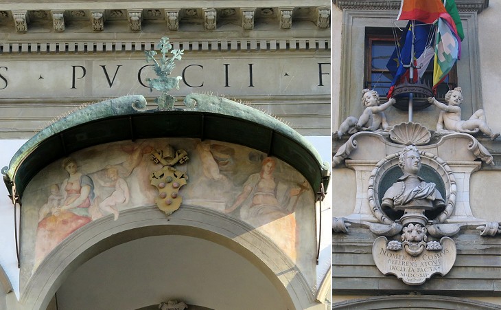 (left) SS. Annunziata: coat of arms of Pope Leo X; (right) Spedale degli Innocenti: 1612 bust of Grand Duke Cosimo II