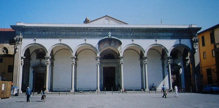 SS. Annunziata is an old church rebuilt between 1450 and 1481 and modified several times in the following centuries. In order to visually relate it to the already existing Spedale degli Innocenti it was preceded by a cloister and by a portico. The central bay of the portico was designed by Antonio da Sangallo the Elder in 1518, while the rest of it was completed towards the end of the XVIth century. By an artful "stretching" of Brunelleschi's design the height of the portico was made consistent with that of Spedale degli Innocenti.