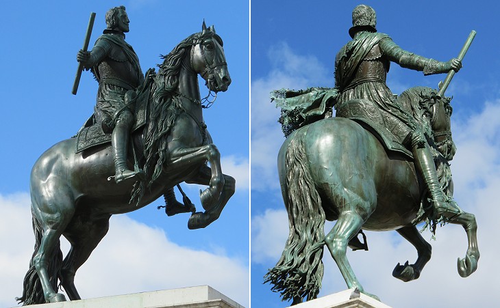 In 1634 King Philip IV commissioned Pietro Tacca with yet another bronze equestrian statue, but he did not want to be portrayed in the same manner as his father. Diego Velazquez provided Tacca with a portrait of the king riding his horse while the animal is prancing on its hind legs. Tacca sought the advice of Galileo Galilei in order to calculate the weight of the (solid) rear section of the statue which was needed to support the (hollow) front one. It was the first equestrian statue to depart from the pattern established by the statue of Marcus Aurelius.