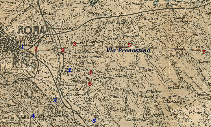 1911 map of the environs of Rome: red numbers: sites covered in this page: 1) il Torrione; 2) Largo Preneste; 3) Tor de' Schiavi; 4) Acquedotto Alessandrino; 5) Tor Tre Teste; 6) Torre di Centocelle; 7) Ponte di Nona. Blue numbers indicate ancient Roman monuments covered in other pages: 1) Porta Maggiore; 2) Tor Pignattara; 3) Tombe della Via Latina; 4) Cecilia Metella; 5) Villa dei Sette Bassi