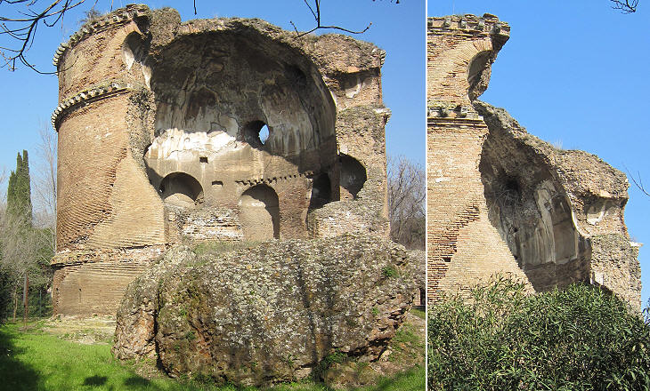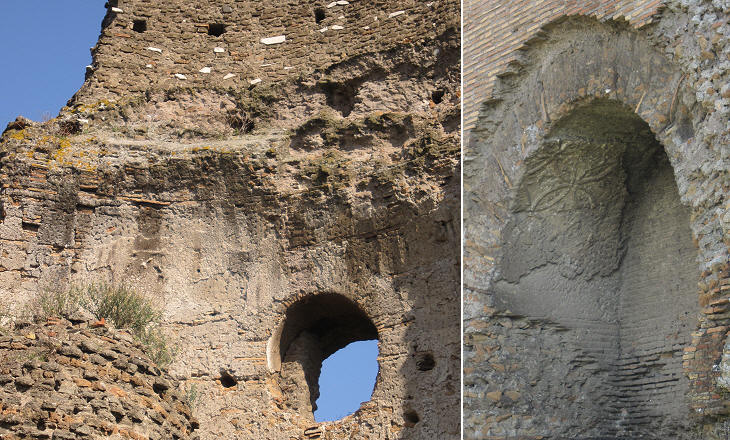 The partial collapse of the dome shows that it was very thin at the top to reduce pressure on the supporting walls; this can be observed also at the Pantheon, the largest ancient dome. The building was for a certain period used as a church and the dome ceiling has some faint traces of frescoes.